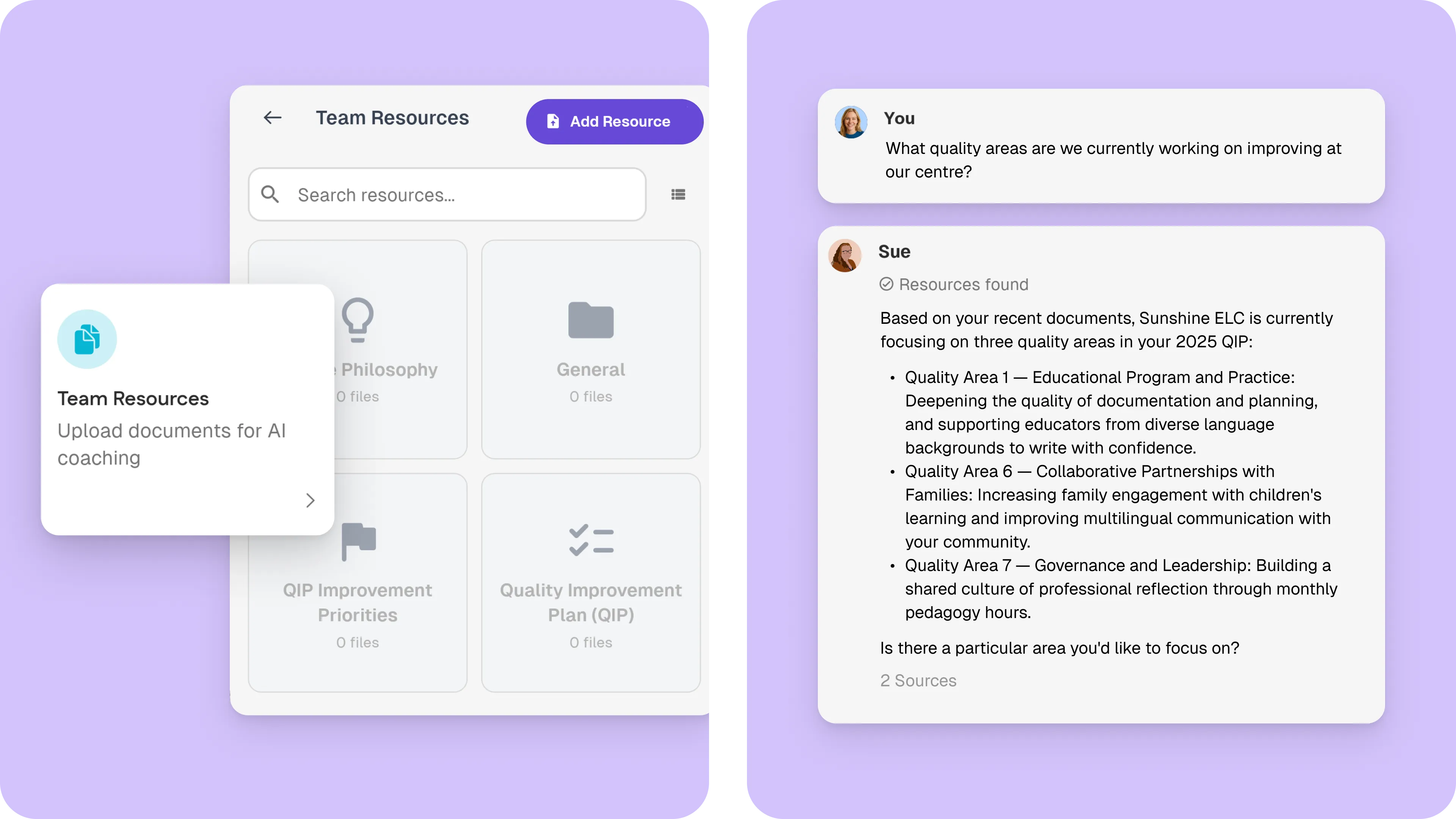 Knowledge lets your service upload internal resources - policies, procedures, your QIP, QPTs, internal evaluations - directly into Mana. Once uploaded, Coach Sue is automatically trained on everything within seconds. Educators can ask Sue questions about your centre's practices and policies in real time, dramatically reducing the time it takes for new staff to get up to speed. Knowledge is available in beta now.