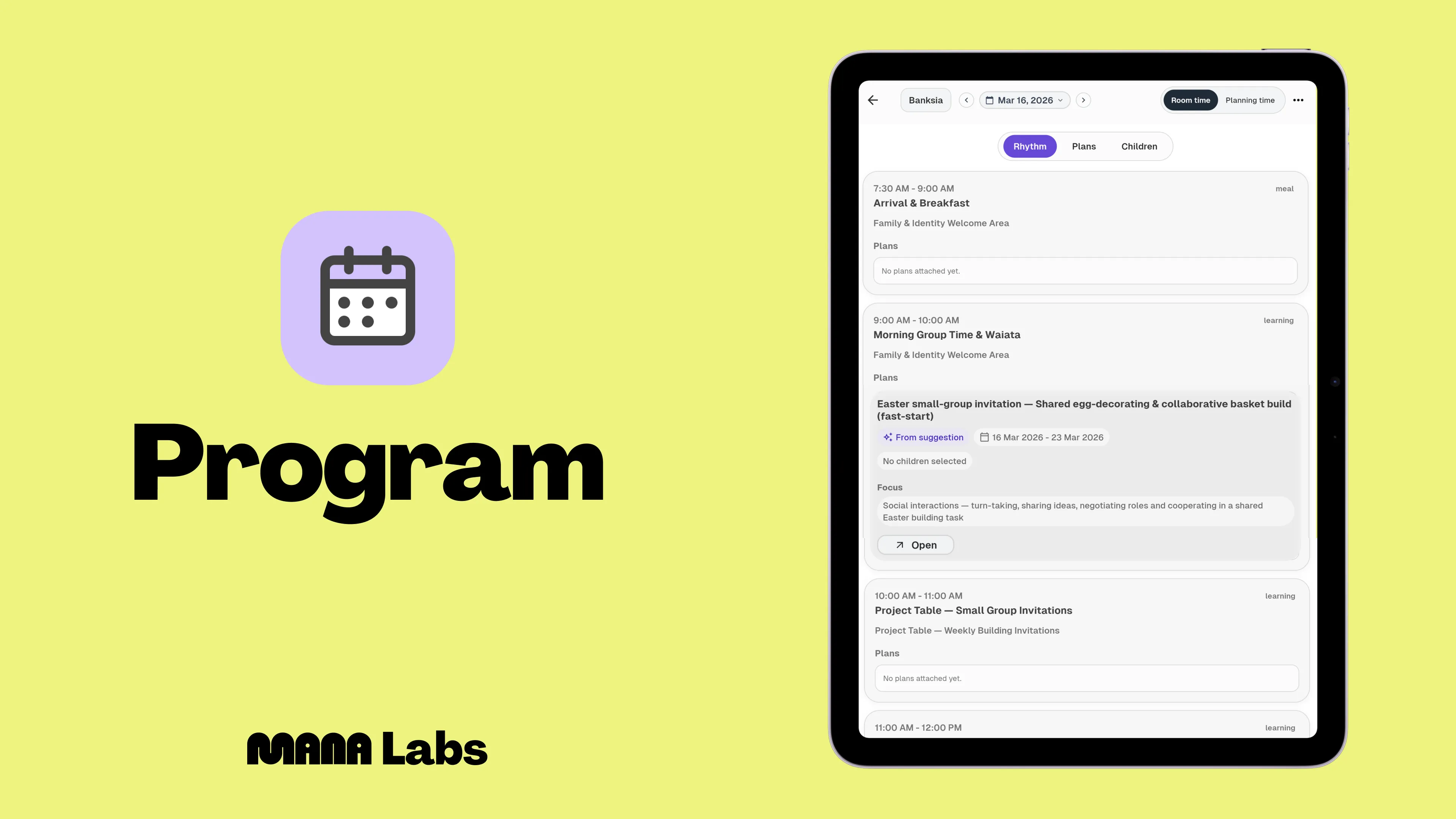 Programme takes Mana into the world of group learning and room-level programming. It's designed to support the full picture of holistic child development - connecting individual learning with emergent programming, team alignment, and quality measurement. Coach Sue extends into Programme to guide educators through each step. Programme is launching in closed beta first, with a deep dive session scheduled for 27 March 2026. More details to come.