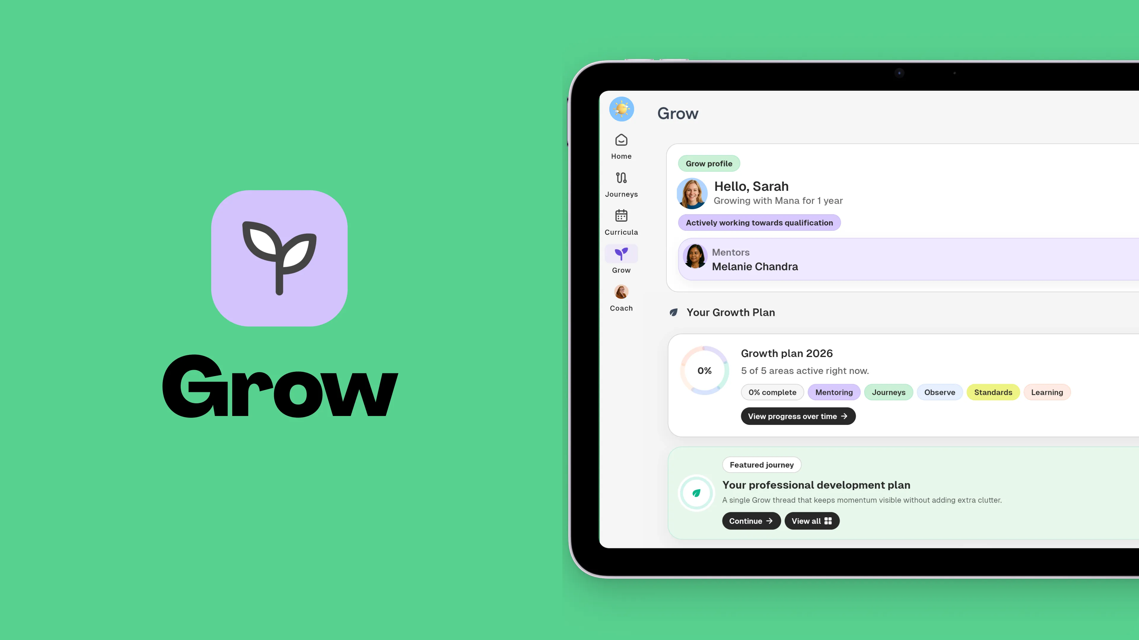 Grow Journeys apply the same journey technology behind child learning to teacher growth. Mentoring sessions are tracked inside Mana, with Coach Sue automatically extracting follow-ups and suggested goals from recorded sessions. Standards alignment - including the National Quality Standards, EYLF, Te Whāriki, and registered teaching standards - is filled in automatically as educators work. Leaders get a real-time dashboard showing progress across the whole team, shifting the focus from quantity of documents to quality of practice.